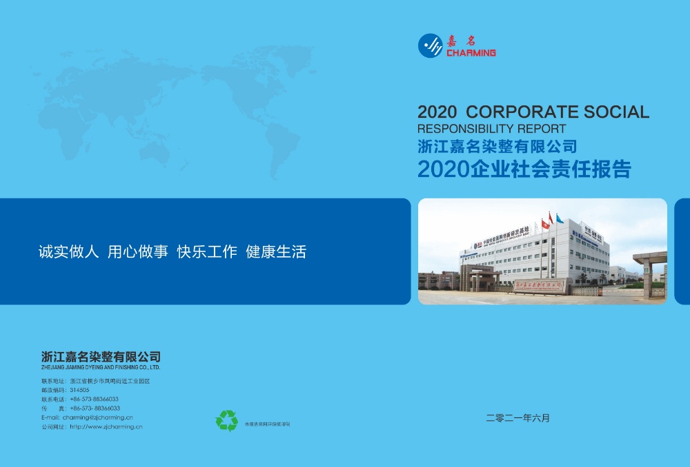 《浙江嘉名控股有限公司2020企業(yè)社會責任報告》本著客觀、透明、誠信、規(guī)范的原則編寫,從責任管理、誠信建設、價值創(chuàng)造、綠色環(huán)保、安全生產、垃圾分類、員工權益、黨群工作、企業(yè)文化、社會公益等責任和行動出發(fā),以豐富的內容、翔實的數據和真實的業(yè)績,全面展示了2019-2020年公司打造實力嘉名、創(chuàng)新嘉名、誠信嘉名、綠色嘉名、和諧嘉名的實踐情況,彰顯了公司為早日實現“致力成為國內外知名服裝品牌的首選面料供應商”的嘉名夢的信心和決心,更向社會公眾呈現了嘉名作為一家民營企業(yè)為履行社會責任,推動行業(yè)和當地社會的可持續(xù)發(fā)展所做出的努力及責任擔當。