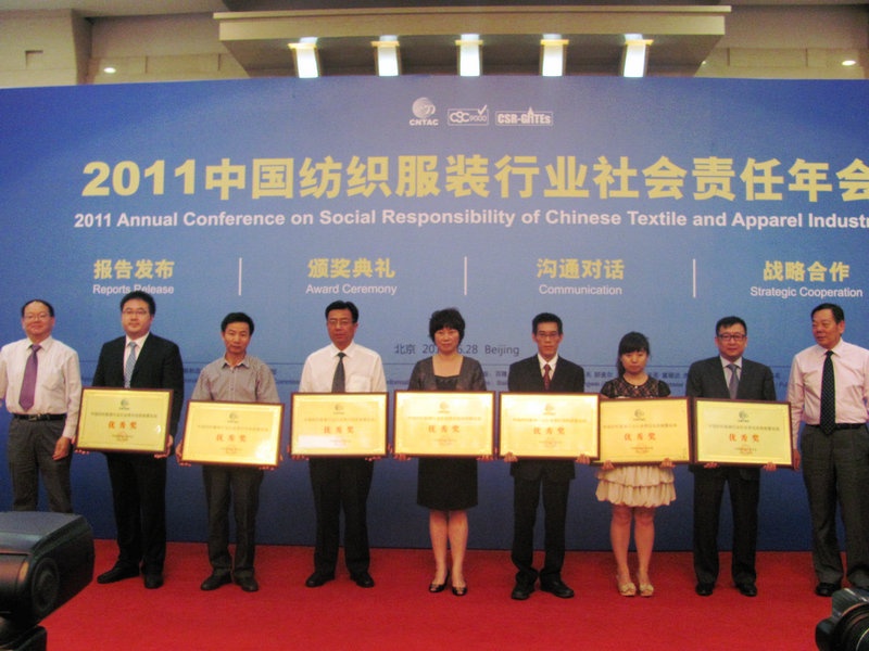 會議期間,中國紡織工業(yè)協(xié)會發(fā)布了“2010-2011中國紡織服裝行業(yè)社會責任報告”,16家紡織服裝企業(yè)同時發(fā)布了企業(yè)的2010年度社會責任報告。我公司發(fā)布的《2010年度社會責任報告》獲得了協(xié)會頒發(fā)的“2011年度中國紡織服裝行業(yè)社會責任信息披露實踐優(yōu)秀獎”。莫總在發(fā)表獲獎感言時表示:在堅持“為顧客創(chuàng)造價值、為企業(yè)增創(chuàng)效益、為員工謀求發(fā)展、為社會多做貢獻”的企業(yè)核心價值觀指導下,我們將繼續(xù)努力,為紡織行業(yè)的發(fā)展做出新的貢獻!
